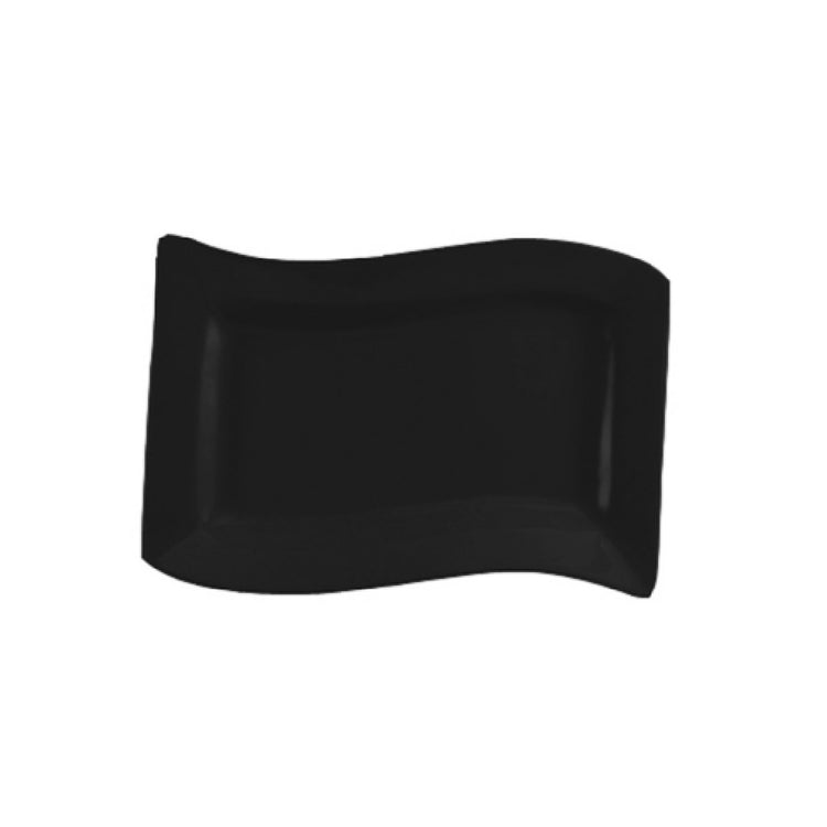 The CAC China SOH-14-BLK Soho Platter is a rectangular serving piece measuring 13-1/2 inches in length, 8-7/8 inches in width, and 1-3/8 inches in height. Crafted with stoneware ceramic, this platter features a distinctive wavy design that adds an elegant touch to any dining presentation. The platter's sophisticated black color enhances its visual appeal, making it suitable for a variety of settings, from upscale restaurants to casual dining environments. Its practical features include being dishwasher, oven, and microwave safe, providing convenience and versatility for users in fast-paced kitchen settings. Sold by the case, each case contains one dozen platters, ideal for establishments that require multiple units for service. The CAC China SOH-14-BLK Soho Platter is a versatile piece that caters to diverse market segments within the hospitality industry, combining aesthetic appeal with practical utility. Its durable construction ensures long-lasting performance, making it a valuable addition to any professional kitchen or dining setup.