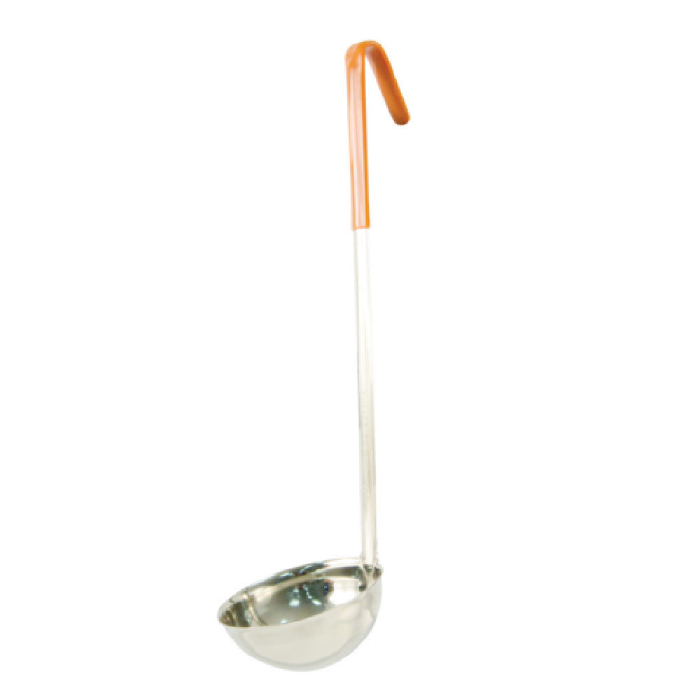 The CAC China SSLD-80OR Ladle 8 Oz. 14-7/8"L is a meticulously crafted one-piece utensil designed for both durability and functionality, featuring an orange handle that adds a vibrant touch to any kitchen environment. Constructed from high-quality stainless steel, this ladle is engineered for longevity and resistance to corrosion, making it a reliable tool for various culinary applications. The ladle's generous capacity of 8 ounces makes it versatile for use in food service operations, from serving soups to dishing out sauces with precision. The total length of 14-7/8 inches ensures a comfortable reach, providing ease of use for chefs and kitchen staff. This product is packaged in cases of 60, catering to the high-volume needs of restaurants, catering services, and institutional kitchens. The CAC China SSLD-80OR Ladle stands out in its category by combining robust construction with practical design, meeting the demands of professional food service while enhancing efficiency and style in meal presentation. Whether used in bustling commercial kitchens or for catered events, this ladle represents a valuable addition to any culinary toolkit, offering a perfect blend of functionality and aesthetic appeal.
