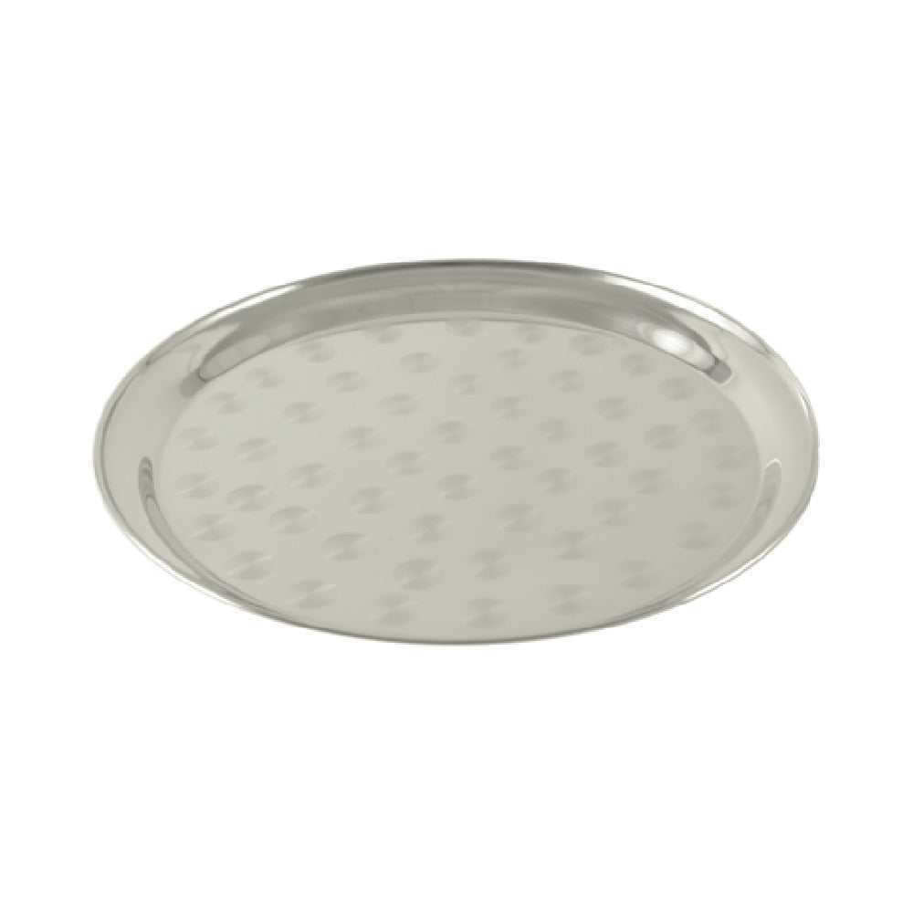 The CAC China SSST-15 Serving Tray is a 15-3/4" diameter round tray crafted to meet the robust demands of various settings within the food service industry. Made from high-quality stainless steel, this serving tray provides a sleek and durable option for both commercial and residential use. Its ample size makes it suitable for presenting an array of culinary creations, from appetizers to full meals. The distinct round shape not only enhances the visual appeal but also facilitates an efficient service, making it ideal for restaurants, hotels, and catering services. The tray is packed with precision, with 24 units included per case, ensuring that establishments can maintain consistency in their service and presentation. The stainless steel construction ensures long-lasting performance, resisting corrosion and maintaining its shine even with frequent use. This combination of design, practicality, and durability underscores the tray's value as a dependable component in any dining experience, whether it's an upscale banquet or a casual gathering. The CAC China SSST-15 Serving Tray is a testament to quality and functionality, reflecting the standards of excellence demanded by professionals in the food service industry.