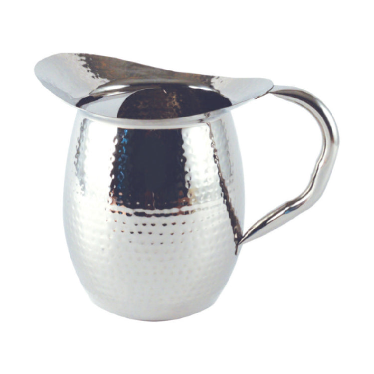 The CAC China SWPH-3G Water/Beverage Pitcher 3 Qt. (96 Oz.) With Ice Guard is a distinguished choice for serving cold beverages in various settings. Constructed from stainless steel, this pitcher features a bell-shaped design that combines both form and functionality. The hammered finish not only adds a touch of elegance but also enhances durability, making it suitable for both commercial and home use. The inclusion of an ice guard is a practical feature that ensures a smooth pour by preventing ice from splashing into glasses, making it ideal for restaurants, catering events, or household gatherings. With a substantial capacity of 3 quarts (96 ounces), this pitcher can hold and dispense a generous amount of liquid, reducing the need for frequent refills. Packed as 24 each per case, it serves the needs of larger establishments efficiently. The sophisticated design and high-quality material make the CAC China SWPH-3G pitcher a versatile and reliable option for anyone looking to serve beverages with style and convenience.