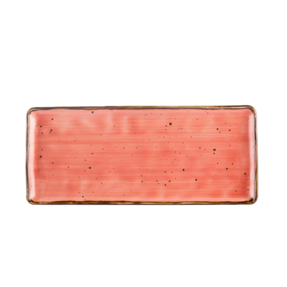 The CAC China TUS-RT13-CRL Tucson Platter is a uniquely designed serving piece with dimensions of 12 inches in length, 5-1/8 inches in width, and 1/2 inch in height, making it suitable for a variety of presentation needs. Crafted from high-quality porcelain, this rectangular platter is not only dishwasher safe but also withstands the heat of ovens and microwaves, enhancing its versatility in both home kitchens and professional culinary environments. The platter's standout feature is its reactive glaze in a captivating Coral color, which adds an artistic touch to any table setting. Sold by the case and packed by one dozen, this platter is ideal for catering businesses or restaurants seeking to make a statement with their dinnerware. The Tucson Platter's combination of aesthetic appeal and practical functionality makes it a valuable addition to any dining collection, appealing to both the hospitality industry and home entertainers. Its robust construction ensures durability, while the elegant design meets the demands for both formal and casual dining experiences.