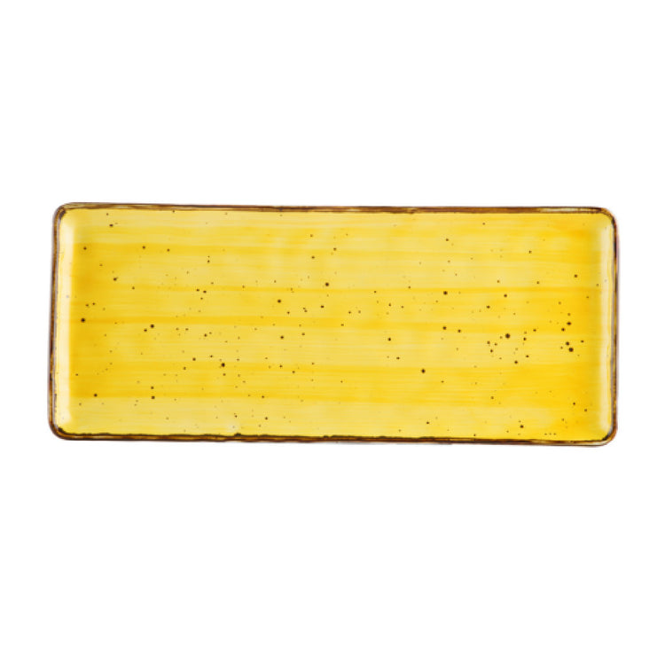The CAC China TUS-RT61-SFL Tucson Platter is a high-quality rectangular serving dish, measuring 16 inches in length, 6-3/4 inches in width, and 5/8 inches in height. Crafted from durable porcelain, this platter features a reactive glaze finish in a vibrant Sunflower color, adding a striking element to any table setting. Designed for versatility and convenience, it is safe for use in dishwashers, ovens, and microwaves, catering to a broad range of culinary applications from casual dining establishments to upscale restaurants. The platter is sold by the case, with each case containing one dozen units, making it a practical choice for commercial use where larger quantities are required. This product’s dimensions and construction make it ideal for serving a variety of dishes, from appetizers to main courses, and its aesthetically pleasing design enhances the presentation of culinary creations. The combination of practicality, durability, and stylish design positions the CAC China TUS-RT61-SFL Tucson Platter as a valuable asset for different market segments within the food service industry, offering a balance of functionality and elegance that meets the demands of both professional chefs and restaurateurs.