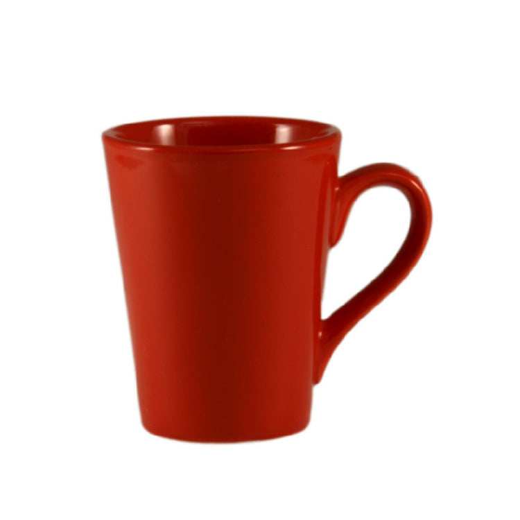 The CAC China VC-12-R Mug Collection Victory Mug is a meticulously crafted stoneware (ceramic) product, featuring a generous capacity of 12 ounces. The mug boasts a round design with precise dimensions of 3-1/2 inches in diameter and 4-3/8 inches in height, offering a comfortable and stylish grip. This versatile piece is available in a vibrant red hue, making it a visually appealing addition to any dining set. It is designed for ease of use and maintenance, being dishwasher, oven, and microwave safe, which makes it a practical choice for both everyday use and special occasions. Sold by the case, the Victory Mug is packed in quantities of 3 dozen per case, making it ideal for catering services, restaurants, and other hospitality businesses that require bulk purchasing. This product blends durability with aesthetic appeal, appealing to different market segments within the food service industry that value both function and form. Its robust construction ensures it stands up to the rigors of everyday use, while its attractive design enhances the dining experience, making it a valuable asset for businesses looking to offer their customers a quality drinking vessel.