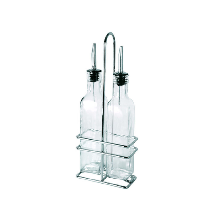 The CAC China W2SQ-8S Oil/Vinegar Cruet Set 8 Oz. is an elegant and functional addition to any dining setup, combining practicality with a touch of sophistication. This set includes two 8 oz. lead-free glass cruets, each thoughtfully designed with a stainless steel pourer for smooth and controlled dispensing of oils or vinegars. These cruets are complemented by a chrome rack, providing a stylish and organized display on any table or countertop. Packed by 12 sets per case, this product is suitable for both small and large scale operations, from intimate family restaurants to bustling commercial kitchens. The use of lead-free glass not only ensures safety and durability but also adds a level of transparency that allows for easy identification of contents, catering to the aesthetic and functional needs of different market segments. The stainless steel pourer enhances precision and reduces spillage, making it an invaluable tool for culinary professionals and home cooks alike. With its blend of durability, safety, and style, the CAC China W2SQ-8S Oil/Vinegar Cruet Set meets the demands of modern dining environments, offering a reliable solution for efficient and elegant service.