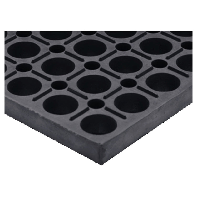The Cactus Mat 4420-CC VIP Duralok Matting Center Section 3' X 5' is a versatile flooring solution crafted for optimal performance in various settings, including bars, service areas, and non-grease kitchen or industrial environments. This mat is 3/4" thick, delivering excellent anti-fatigue and anti-slip properties, which are essential for long hours of standing work. Its interlocking design, made possible by a molded rubber connector system, allows for easy installation and the creation of a seamless matting area when combined with other sections. The stub edge on two sides enhances the mat's adaptability, enabling a smooth transition between matting sections. One of its key features is excellent drainage, which significantly reduces the risk of slipping due to liquid accumulation. Available in black, the Cactus Mat 4420-CC is designed to withstand heavy usage while providing comfort and safety. This product's unique value proposition lies in its durability and adaptability, making it a preferred choice for commercial and industrial spaces requiring effective floor safety solutions. Its technical specifications ensure it meets the demands of high-traffic environments, making it both a practical and efficient choice for maintaining workplace safety and comfort.