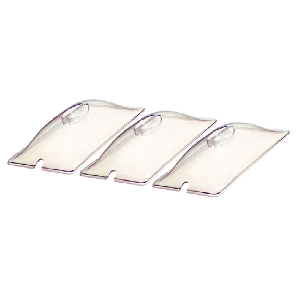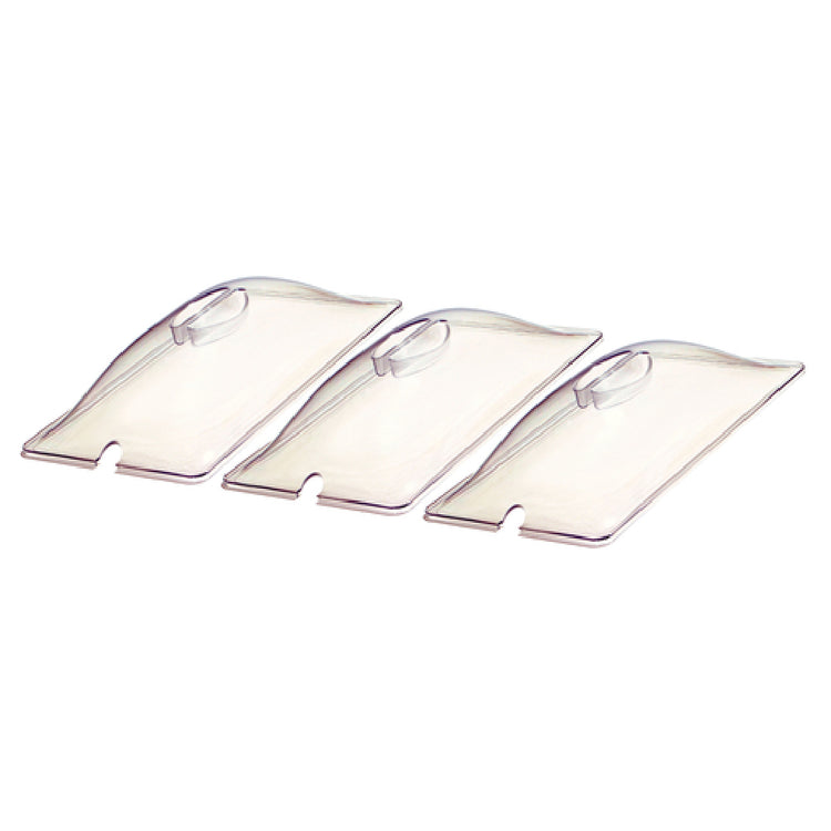 The Cadco CL-3 Lids Accessory Pack - third-size, 12-7/8" x 7" is a specialized solution designed for culinary professionals seeking durability and utility. This accessory pack includes three third-size polycarbonate lids, each measuring 12-7/8 inches by 7 inches. Known for its robust and clear polycarbonate construction, the CL-3 ensures long-lasting performance and easy visibility of contents. A notable feature of these lids is the integrated utensil slot, which enhances functionality by allowing utensil storage while minimizing kitchen clutter. The polycarbonate material offers superior resistance to breakage, making it an ideal choice for high-traffic environments such as commercial kitchens, catering services, and institutional dining facilities. The clear design not only aids in quick identification of stored items but also maintains an aesthetically pleasing appearance. With three lids per pack, this accessory set ensures comprehensive coverage for third-size pans, providing flexibility and convenience across various culinary settings. Whether used in bustling restaurants or efficient meal prep areas, the Cadco CL-3 Lids Accessory Pack stands out as a practical and reliable addition, perfectly suited for the demanding requirements of the food service industry.