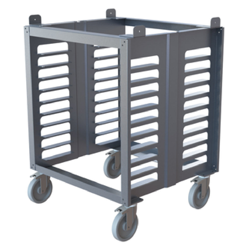 Cadco OST-195-C Oven Stand - full size mobile - is a heavy-duty appliance accessory designed for seamless integration with professional kitchen environments. Its open base structure features pan rack slides, accommodating up to 10 full-size sheet pans (pans not included), which enhances its utility in high-demand settings such as bakeries and catering services. Constructed from durable aluminum, this oven stand ensures longevity and supports rigorous daily use. The Cadco OST-195-C is equipped with four casters, allowing for effortless mobility; two casters feature brakes for stability during use, while the other two have directional locks, providing both flexibility and control in positioning. This stand is expertly engineered to fit two full-size Cadco ovens, making it an excellent choice for kitchen professionals looking to maximize their oven capacity with a reliable and robust support structure. Its thoughtful design not only facilitates efficient kitchen workflows but also complements the functionality and efficiency of high-volume cooking operations. With the Cadco OST-195-C Oven Stand, culinary professionals can expect a product that meets their specific needs for durability, mobility, and compatibility in a busy kitchen setting.