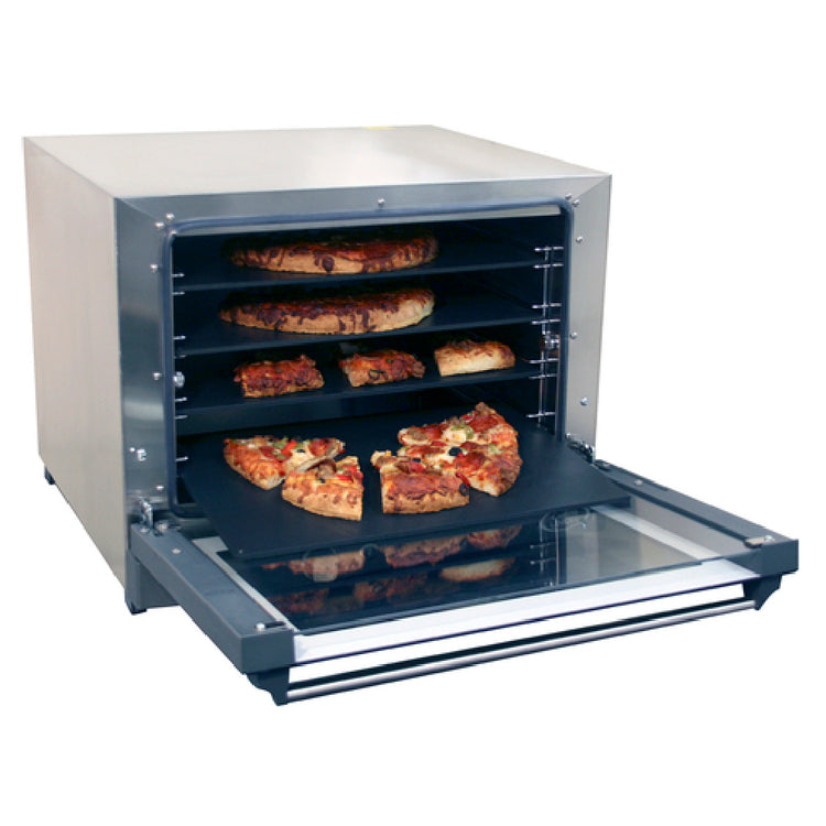 The Cadco OV-023P Convection Oven Electric Countertop is a versatile and robust kitchen appliance designed to meet the needs of various culinary professionals. With a half-size sheet pan capacity, it accommodates up to four half-size sheet pans, although pans are not included. This oven offers precise time and temperature controls, enabling operation within a range of 175-500°F, which is suitable for a wide array of cooking requirements. The inclusion of four pizza heat plate shelves expands its functionality, making it ideal for bakeries and pizzerias. Its construction features an insulated double wall with a cool-touch glass door, ensuring safety and energy efficiency. Constructed with durable stainless steel, this oven is built to withstand the demands of a bustling kitchen environment. Operating at 208-240v/60/1-ph and a power consumption of 2.7kW with 11.25 amps, it utilizes a NEMA 6-15P plug. This model is certified by NSF and MET, affirming its compliance with rigorous safety and sanitation standards. The Cadco OV-023P Convection Oven is a reliable addition to any food service operation, combining advanced functionality with ease of use, making it suitable for both small cafés and large commercial kitchens.