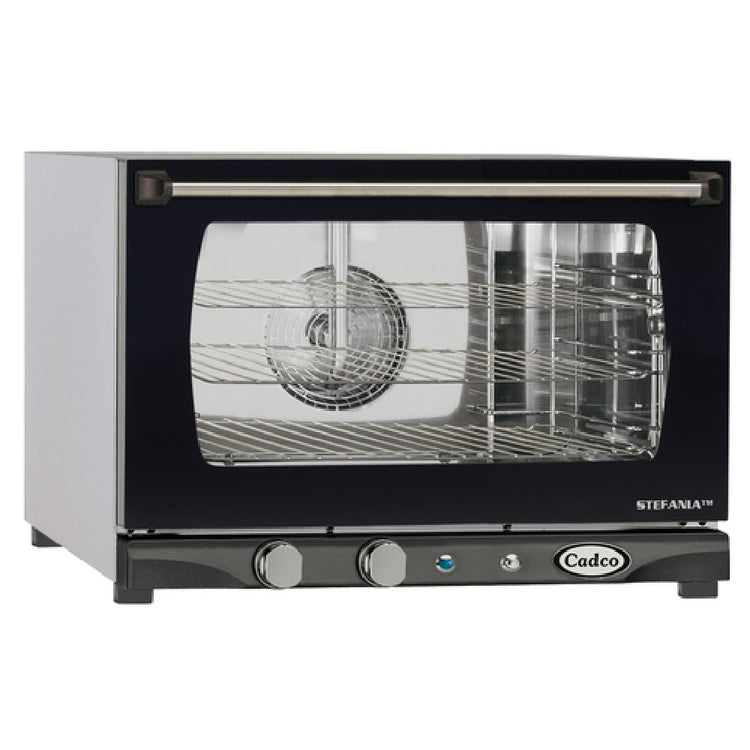 The Cadco XAF-113 Convection Oven Electric Countertop is a versatile and compact solution for professional kitchens requiring efficient baking and roasting capabilities. This half-size convection oven accommodates up to three half-size sheet pans, although the pans themselves are not included. It features three robust shelves, allowing for flexible arrangement of food items. Operating within a temperature range of 175-500°F, this oven provides precise manual control over time, temperature, and humidity, making it adaptable to a variety of cooking tasks. The unit is equipped with a 60-minute timer and an option for continuous operation, catering to different cooking durations. An LED door light enhances visibility, while the insulated double-wall cool-touch glass door ensures safety and energy efficiency. Included with the oven is the EL080 auxiliary water pump kit, adding functionality for humidity control. The oven's black front and Dura-Body heavy-duty stainless steel construction ensure durability and longevity. It operates at 120v/60/1-ph with a power rating of 1.45kW and 12.0 amps, utilizing the NEMA 5-15P plug, and is NSF and cMETus certified, highlighting its compliance with industry standards. The Cadco XAF-113 is an ideal choice for cafes, small restaurants, and catering services looking for reliable and high-performance countertop equipment.