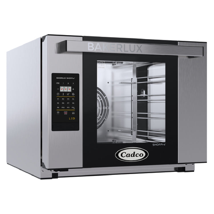 The Cadco XAFT-04HS-LD Bakerlux LED Heavy-Duty Convection Oven is an electric countertop appliance designed for optimal efficiency in various professional cooking environments. With its half-size design, it accommodates four half-size sheet pans (pans not included) and includes four adjustable shelves. This advanced oven operates within a temperature range of 175-500°F, featuring digital touch controls that allow precise adjustments for time, temperature, and humidity, with a 10-hour timer or continuous operation option. Its programming capacity is noteworthy, capable of saving up to 99 programs, including 12 quick-access options for streamlined baking processes. The oven is equipped with an interior LED light and an automatically reversible fan with two speed settings to ensure even cooking results. Additionally, the electro valve facilitates a direct water connection, enhancing its functionality in busy kitchens. The bottom-hinged glass door and heavy-duty stainless steel construction underscore its durability. Operating on 208-240v/60/1-ph at 3800 watts with a 16.0-amp draw, it is compatible with NEMA 6-20P outlets. Certified by NSF, cMETus, and ENERGY STAR, this oven is a testament to energy efficiency and safety standards, and it can also accommodate an optional proofer if needed.