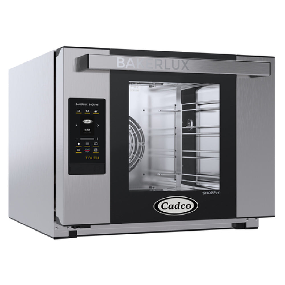 The Cadco XAFT-04HS-TD Bakerlux™ TOUCH Heavy-Duty Convection Oven Electric Countertop is an advanced appliance designed for professional culinary environments. This half-size convection oven boasts a capacity to accommodate four half-size sheet pans (not included) across four shelves. It caters to a wide temperature range of 175-500°F, providing flexibility for a variety of cooking requirements. The oven is equipped with digital touch controls that manage time, temperature, and humidity, featuring a 10-hour timer or continuous operation mode. An innovative aspect of this model is its ability to execute up to nine baking steps and save up to 99 baking programs, facilitated by a graphic control panel with USB and Wi-Fi capabilities. The oven is built with an interior LED light and an automatically reversible fan with two speeds, enhancing its operational efficiency. A built-in electro valve supports direct water connection, further augmenting its utility. The robust construction is evident in its heavy-duty stainless steel build and bottom-hinged glass door, ensuring durability. Operating at 208-240v/60/1-ph with 3800 watts and 16.0 amps, it is compliant with NEMA 6-20P, NSF, cMETus, and ENERGY STAR® standards, making it a reliable choice for diverse food service segments. This model can also run an optional proofer.