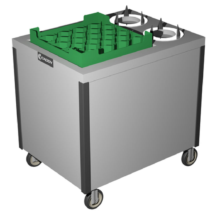 The Caddy CM-2620-10 Caddy Magic Cup/Saucer Rack Dispenser Cabinet Style Without Door is an efficient and practical solution for food service operations requiring organized storage and easy access to cups and saucers. This unheated unit is specifically designed to accommodate 20" x 20" racks with a substantial capacity to hold up to 140 cups and saucers, each with a diameter of up to 5-3/4 inches. Featuring a self-leveling platform, it ensures stability and balanced support of stored items. The inclusion of two adjustable cylinder dispensers enhances its functionality by providing flexibility in organizing various cup and saucer sizes. To safeguard against accidental impacts, plastic vertical corner bumpers are strategically installed, promoting longevity and maintaining the unit's appearance. The cabinet is mounted on 4" swivel casters, facilitating effortless mobility and repositioning within the workspace. The Caddy CM-2620-10 is also NSF certified, reinforcing its adherence to public health and safety standards. This rack dispenser is particularly suited for professional dining facilities, cafeterias, and catering services, where high-capacity storage and ease of access to cups and saucers are essential. Its thoughtful design and durable construction make it an indispensable asset in any fast-paced kitchen environment.