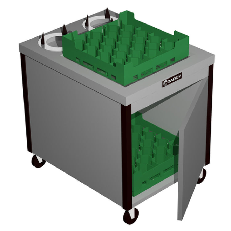 The Caddy CM-2620-D-10 Caddy Magic Cup/Saucer Rack Dispenser Cabinet Style With Door is a specialized storage solution designed for efficient organization in food service environments. This unheated cabinet is constructed to accommodate 20" x 20" racks, with a substantial capacity to hold up to 140 cups and saucers with diameters up to 5-3/4". Featuring a self-leveling platform, it ensures stability and ease of access to stored items. The cabinet includes two adjustable cylinder dispensers, allowing for versatile organization and retrieval of cups and saucers. To protect surrounding surfaces and equipment, the unit is equipped with plastic vertical corner bumpers. For mobility, this dispenser cabinet is mounted on 4" swivel casters, facilitating easy relocation within a workspace. Certified by NSF, this product adheres to strict public health and safety standards, making it a dependable choice for commercial kitchens, catering services, and hospitality sectors. Its thoughtful design and sturdy construction offer a reliable and efficient storage and dispensing solution, contributing to streamlined operations in busy food service settings. The Caddy CM-2620-D-10 combines practicality with durability, providing a valuable asset for establishments requiring systematic organization of dining service ware.