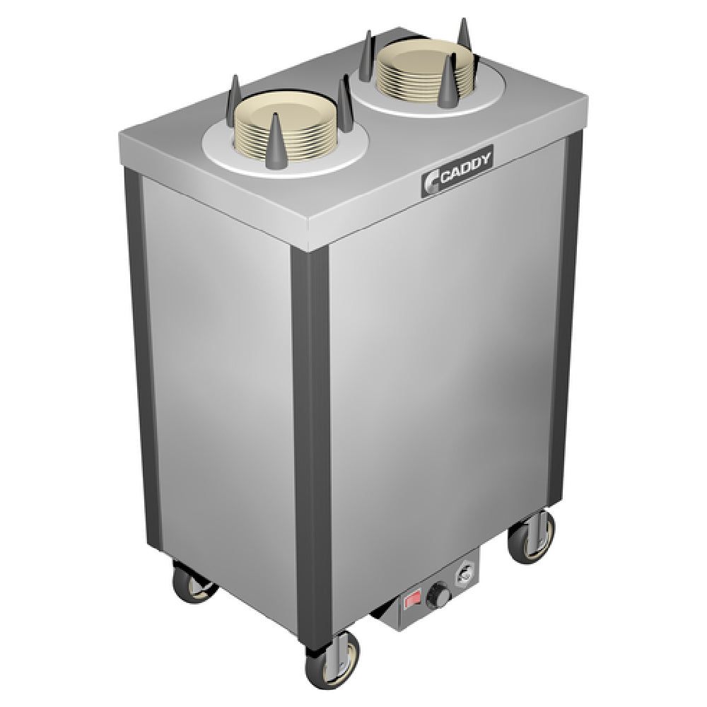The Caddy CM-S-102-H Caddy Magic Dish Dispenser Cabinet Style Heated is a versatile and efficient solution designed to cater to diverse needs within the food service industry. This cabinet-style unit features two self-leveling adjustable dispensing cylinders, accommodating approximate dish sizes from 0 inches to 5-3/4 inches in diameter. Constructed with a stainless steel top and plastic corner bumpers, it ensures durability and safety during operation. The integrated stainless steel electric control box with an on/off switch allows for easy management of the heating function, enhancing functionality in high-demand environments. For mobility and stability, the unit is equipped with 4-inch swivel casters, two of which include brakes to hold the unit steady. The Caddy CM-S-102-H is ETLus and NSF certified, underscoring its compliance with stringent safety and sanitation standards. This product's unique value proposition lies in its ability to efficiently dispense and maintain dish temperatures, making it a valuable asset for restaurants, catering services, and institutional kitchens seeking dependable and user-friendly dish management solutions. Its thoughtful design and robust construction ensure that it meets the rigorous demands of the hospitality industry, providing reliable performance every time it is used.
