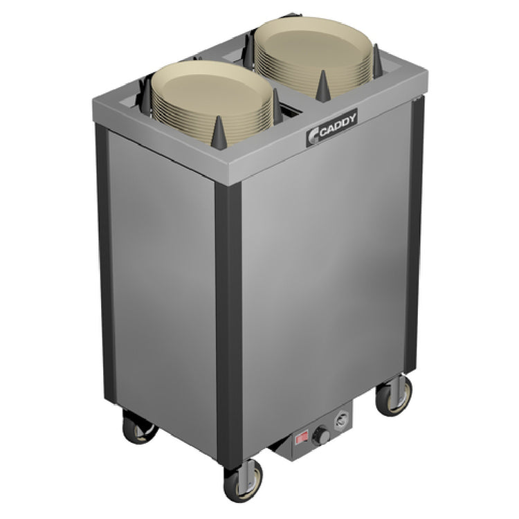 The Caddy CM-S-132-H Caddy Magic Platter Dispenser Cabinet Style Heated is a sophisticated solution for efficient dish management in professional food service environments. This cabinet-style unit features two self-leveling adjustable dispensing cylinders, each designed to accommodate dish sizes approximately 10-1/2 inches by 13 inches in diameter, ensuring compatibility with a range of platter sizes. The stainless steel top and electric control box highlight its robust construction and user-friendly interface, providing both durability and ease of use in demanding settings. Plastic corner bumpers are integrated to protect surrounding surfaces, while the 4-inch swivel casters ensure effortless mobility across various floor types. An on/off switch offers straightforward operation, making it accessible for staff at all skill levels. Additionally, this model is certified by ETLus and NSF, validating its adherence to rigorous safety and sanitation standards. Such features make it a versatile choice for catering services, banquet halls, and other high-volume dining facilities that prioritize efficiency and reliability. The Caddy CM-S-132-H's combination of advanced features and durable construction positions it as an essential asset for any operation requiring consistent, high-capacity dish dispensing.