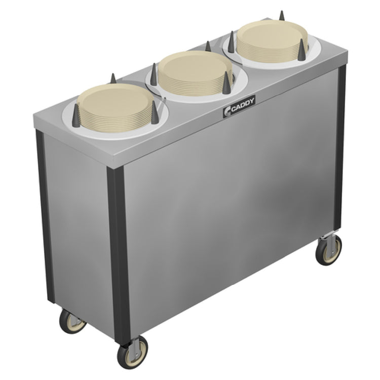 The Caddy CM-S-403 Caddy Magic Dish Dispenser Cabinet Style Unheated is a highly specialized tool designed for efficient dish handling in commercial settings. It features a slim line design that incorporates three self-leveling adjustable dispensing cylinders, accommodating dish sizes ranging from 9-5/8 inches to 10-1/8 inches in diameter. This unit is constructed with a durable stainless steel top that ensures longevity and easy cleaning, making it suitable for high-traffic environments. The inclusion of plastic corner bumpers adds an extra layer of protection, safeguarding both the unit and surrounding areas from potential impact damage. Equipped with 4-inch swivel casters, this dispenser offers exceptional mobility, allowing it to be easily moved and repositioned within various service areas. It is NSF certified, attesting to its adherence to strict public health and safety standards, and making it an ideal choice for restaurants, cafeterias, and any food service operation requiring reliable dish dispensing solutions. The unheated design of the Caddy CM-S-403 further simplifies maintenance while ensuring consistent performance in diverse operational contexts. This dish dispenser is engineered to meet the unique needs of professional kitchens, providing a blend of functionality and quality construction.