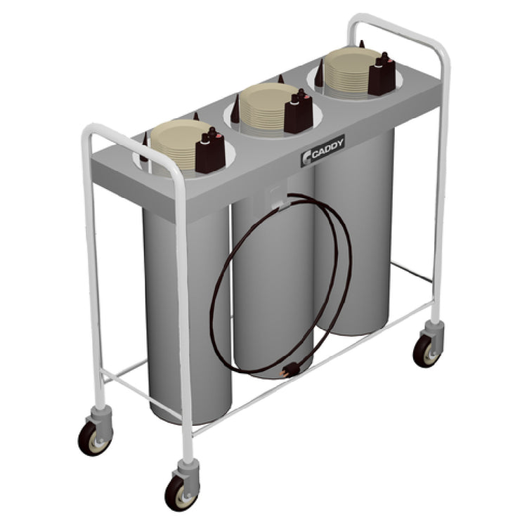 The Caddy CM-T-103-H Caddy Magic Dish Dispenser is an open style heated unit designed to efficiently accommodate various operational environments with its slim line construction. It features three self-leveling adjustable dispensing cylinders that cater to dish sizes ranging from 0 to 5-3/4 inches in diameter. This dispenser is built with a reinforced stainless steel top and a welded stainless steel tubular frame, ensuring durability and longevity. The stainless steel electric box is equipped with an easy-to-use on/off switch and an adjustable thermostat for precise temperature control. Mobility is enhanced with 4-inch swivel casters, two of which include brakes for stability. Operating at 120 volts, 60 Hz, and 8.8 amps, the dispenser delivers 1050 watts of power and is equipped with a NEMA 5-15P plug. Certified by ETLus and NSF, it meets rigorous safety and sanitation standards. The Caddy CM-T-103-H is a versatile solution for establishments ranging from casual eateries to high-volume food service operations, where efficient dish dispensing and temperature maintenance are critical.