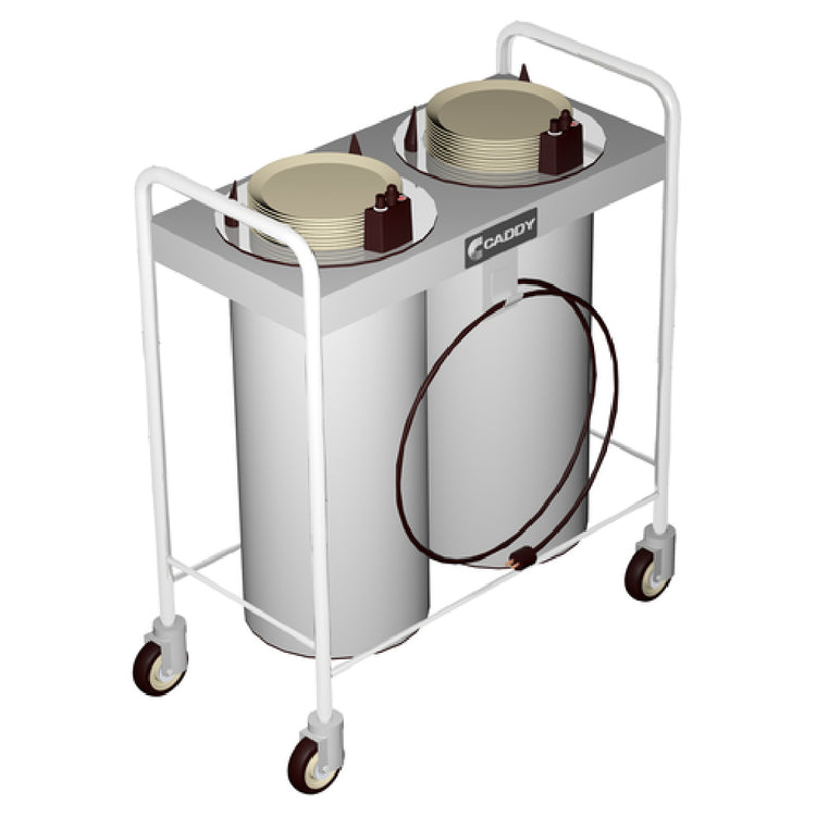 The Caddy CM-T-302-H Caddy Magic Dish Dispenser Open Style Heated is a highly efficient and versatile solution designed for the dynamic needs of the food service industry. This product features an open style design with two self-leveling adjustable dispensing cylinders, accommodating dish sizes ranging from 7-3/8 to 9-1/2 inches in diameter. Constructed with a reinforced stainless steel top and a welded stainless steel tubular frame, it ensures durability and longevity in high-demand environments. The dispenser is equipped with a stainless steel electrical box, an on/off switch, and an adjustable thermostat, providing precise control over the heating elements. The mobility of the unit is enhanced by 4-inch swivel casters, two of which come with brakes for secure placement. Operating at 120 volts with a single-phase 60 Hz electrical supply, it draws 8.3 amps and consumes 1000 watts of power, utilizing a NEMA 5-15P plug configuration. Certified by ETLus and NSF, this dish dispenser meets stringent safety and sanitation standards. The Caddy CM-T-302-H is an excellent choice for restaurants, cafeterias, and catering services looking for a reliable, high-capacity dish dispensing solution that integrates seamlessly into various operational settings.