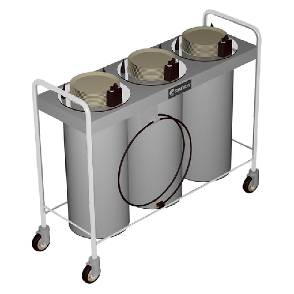 The Caddy CM-T-303-H Caddy Magic Dish Dispenser Open Style Heated is a versatile and efficient solution for various food service environments needing reliable dish dispensing capabilities. This slimline device features three self-leveling adjustable dispensing cylinders capable of accommodating dish sizes ranging from 7-3/8 to 9-1/2 inches in diameter. The unit is constructed with a reinforced stainless steel top and a welded stainless steel tubular frame, ensuring durability and long-lasting performance. The heated design maintains optimal dish temperature, while the stainless steel electric box houses an on/off switch and an adjustable thermostat for precise temperature control. Equipped with 4-inch swivel casters, two of which come with brakes, the Caddy CM-T-303-H offers easy maneuverability and secure positioning. Operating at 120 volts, with a power output of 12.5 amps and 1500 watts, the unit is fitted with a NEMA 5-15P plug, making it compatible with standard electrical outlets. Certified by ETLus and NSF, this dish dispenser meets essential safety and sanitation standards, making it an ideal choice for restaurants, cafeterias, and catering services seeking efficient and hygienic dish management solutions. Its robust construction and thoughtful design provide a seamless integration into any professional kitchen setting.