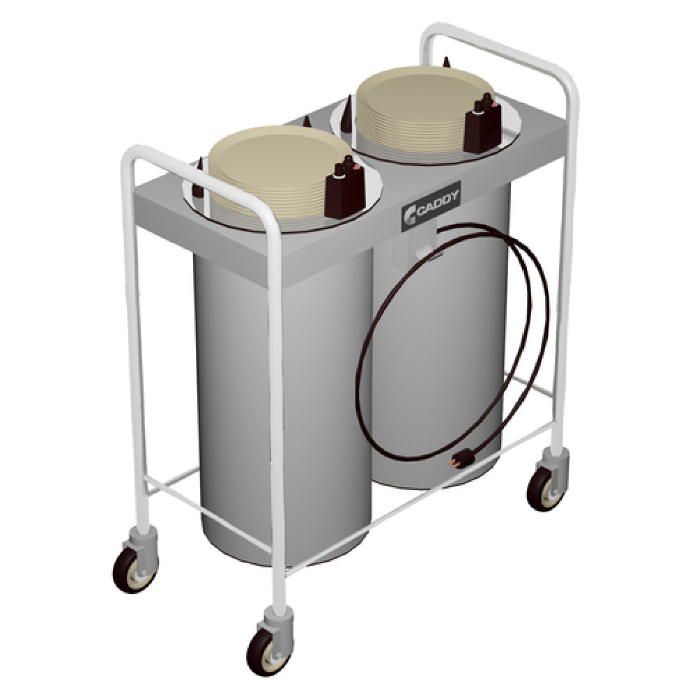The Caddy CM-T-402-H Caddy Magic Dish Dispenser Open Style Heated is a high-performance dish dispensing solution designed for efficiency and reliability in food service environments. This unit features two self-leveling adjustable dispensing cylinders that accommodate approximate dish sizes ranging from 9-5/8" to 10-1/8" in diameter, providing versatility for various dish types. The dispenser is constructed with a reinforced stainless steel top and a welded stainless steel tubular frame, ensuring durability and longevity in demanding settings. It is equipped with a stainless steel electrical box with an on/off switch and an adjustable thermostat, allowing precise temperature control. The system operates at 120 volts with a power consumption of 8.3 amps and 1000 watts, and it is compatible with a NEMA 5-15P plug. For mobility and stability, the dispenser is mounted on 4" swivel casters, two of which have brakes. The unit is ETLus and NSF certified, emphasizing its compliance with safety and health standards. This combination of features makes the Caddy CM-T-402-H an invaluable asset for restaurants, catering services, and institutional kitchens that require efficient and reliable dish dispensing solutions.