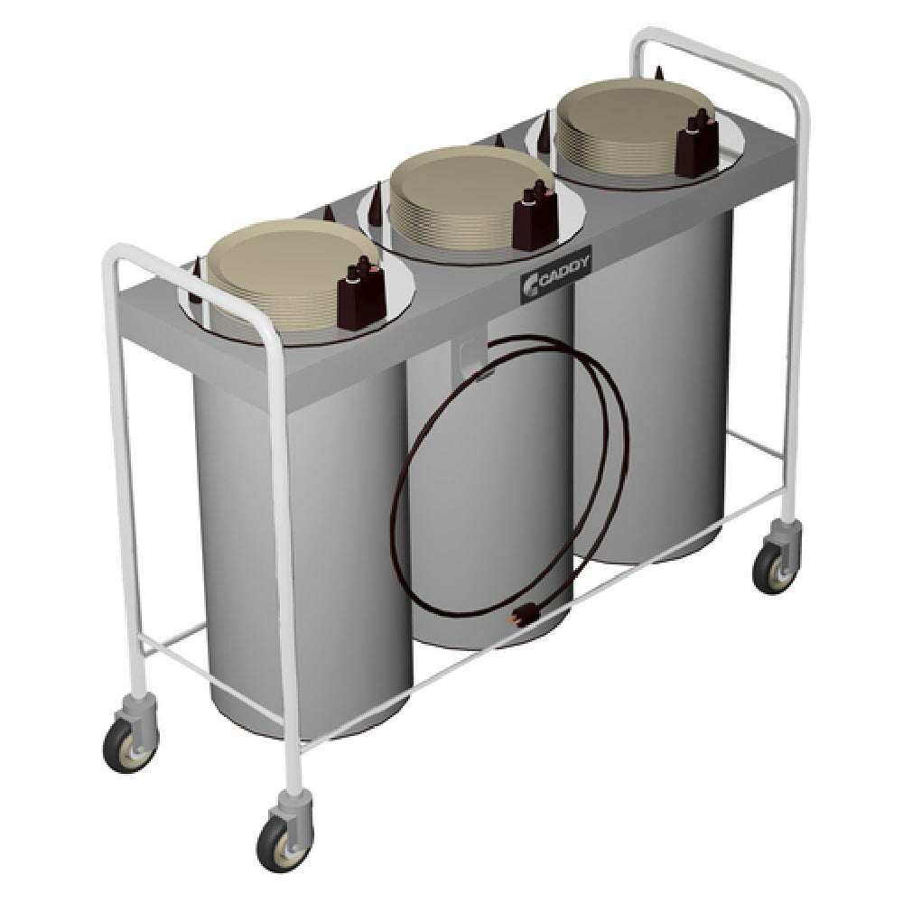The Caddy CM-T-403-H Caddy Magic Dish Dispenser Open Style Heated is engineered for optimal performance and efficiency in food service environments. This slim line dispenser features three self-leveling adjustable dispensing cylinders, accommodating dish sizes ranging from 9-5/8" to 10-1/8" in diameter, ensuring versatility in various settings. Constructed with a reinforced stainless steel top and a welded stainless steel tubular frame, the unit promises durability and stability. The stainless steel electric box houses an adjustable thermostat and an on/off switch, providing precise temperature control for heated dispensing. With four-inch swivel casters, including two with brakes, the dispenser offers easy mobility and secure positioning. Operating at 120v/60/1-ph, the unit draws 12.5 amps and utilizes 1500 watts, making it both powerful and efficient. The dispenser is equipped with a NEMA 5-15P plug and is certified by ETLus and NSF, ensuring compliance with safety and health standards. Ideal for catering companies, hotels, and restaurants, the Caddy CM-T-403-H combines technological sophistication with practical design, meeting the demands of high-volume food service operations. Its robust construction and advanced features make it a valuable asset for any establishment looking to enhance its dish dispensing capabilities.