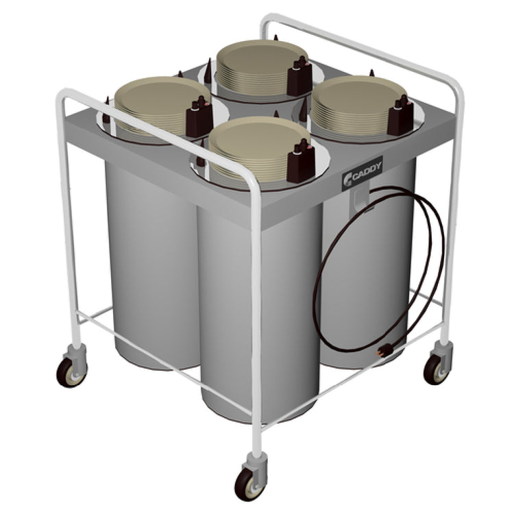 The Caddy CM-T-404-H Caddy Magic Dish Dispenser Open Style Heated is uniquely designed for precision and efficiency in high-traffic culinary environments. This heated dispenser features four self-leveling adjustable dispensing cylinders, accommodating dish sizes ranging from 9-5/8 inches to 10-1/8 inches in diameter. Its reinforced stainless steel top and welded stainless steel tubular frame ensure durability and long-lasting performance, making it a reliable choice for busy kitchens. The stainless steel electric box is equipped with an on/off switch and an adjustable thermostat to maintain optimal dish temperatures. Engineered for mobility, this unit includes 4-inch swivel casters, with two featuring brakes for secure positioning. Operating at 120 volts, 60/1 phase, with a current draw of 16.6 amps and power rating of 2000 watts, it connects via a NEMA 5-20P plug, ensuring compatibility with standard commercial electrical systems. Certified by ETLus and NSF, the Caddy CM-T-404-H not only meets rigorous safety and sanitation standards but also provides a practical solution for restaurants, catering services, and other food service establishments seeking efficient and reliable dish dispensing capabilities. Its robust construction and user-friendly design present a valuable asset for enhancing operational workflow and maintaining service excellence.