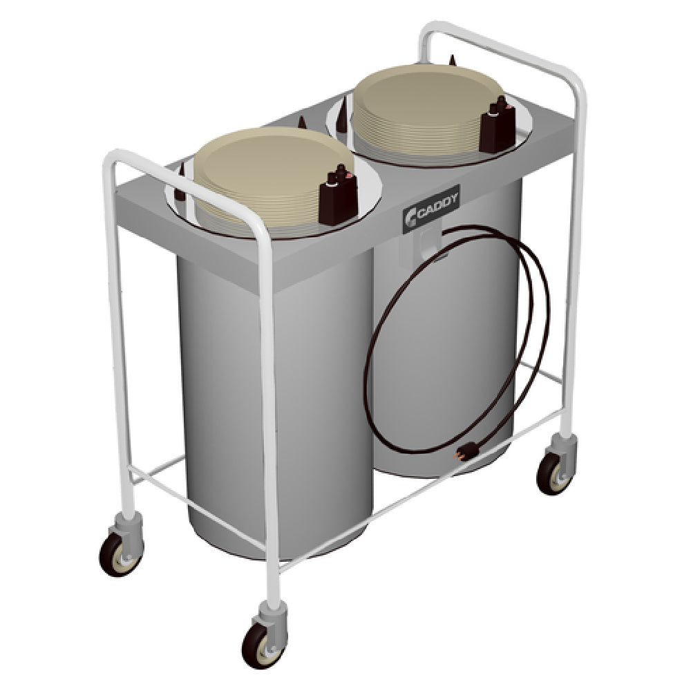 The Caddy CM-T-502-H Caddy Magic Dish Dispenser Open Style Heated is a versatile solution designed for commercial settings requiring efficient dish management. Featuring two self-leveling adjustable dispensing cylinders, this unit accommodates dish sizes ranging from 10-1/4 inches to 12 inches in diameter, providing flexibility for various dishware. Constructed with a reinforced stainless steel top and a welded stainless steel tubular frame, the dispenser ensures durability and reliability in high-demand environments. The stainless steel electrical box is equipped with an on/off switch and an adjustable thermostat, allowing precise temperature control to meet diverse operational needs. Mobility is enhanced with 4-inch swivel casters, two of which include brakes for stability, making it easy to maneuver within any workspace. Operating at 120 volts and drawing 10.8 amps with a power output of 1300 watts, it connects using a NEMA 5-15P plug. Certified by ETLus and NSF, the Caddy CM-T-502-H meets stringent safety and sanitation standards, making it an ideal choice for food service professionals seeking a reliable and efficient dish dispensing solution.