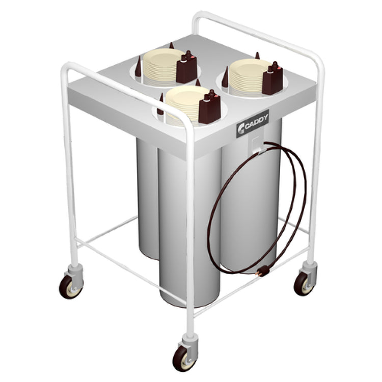 The Caddy CM-TQ-103-H Caddy Magic Dish Dispenser Open Style Heated is engineered for efficient dish handling in high-demand environments. This open-style, heated unit features three self-leveling adjustable dispensing cylinders, accommodating dish sizes ranging from 0 inches to 5-3/4 inches in diameter, which makes it suitable for diverse dining settings. The device is constructed with a reinforced stainless steel top and a welded stainless steel tubular frame, ensuring durability and long-lasting performance. Its stainless steel electric box houses an on-off switch and an adjustable thermostat, allowing precise temperature control to maintain dish readiness. Mobility is enhanced by 4-inch swivel casters, two of which are equipped with brakes for stability during use. Operating at 120 volts with a 60/1-ph electrical requirement, the dispenser draws 8.8 amps and consumes 1050 watts, connecting via a NEMA 5-15P plug. Certified by ETLus and NSF, this dish dispenser adheres to strict safety and sanitation standards. The Caddy Magic Dish Dispenser is ideal for foodservice operations seeking reliable and efficient plate management solutions, offering unique value through its rugged construction and versatile capacity, making it a valuable asset across different segments of the hospitality industry.