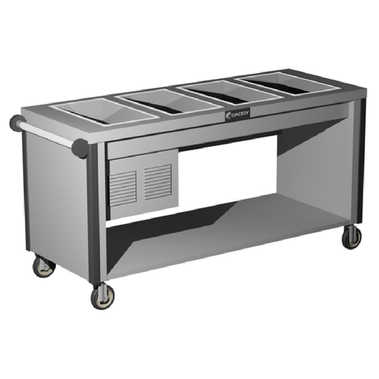 The Caddy RIF-604 Cold Pan Unit is a versatile electric unit designed for efficient cold storage and presentation. Measuring 67"W x 26"D x 34-1/2"H, this unit features an open base and is built with durable stainless steel construction, ensuring longevity and ease of maintenance. It is equipped with four 12" x 20" openings, providing ample space for various food products and applications. The unit includes vertical corner bumpers and 4" heavy-duty swivel casters, two of which come with brakes, allowing for smooth mobility and secure positioning within any food service environment. Operating at 120v/60/1-ph with a power draw of 5.8 amps, the Caddy RIF-604 utilizes a self-contained refrigeration system powered by a 1/4 hp motor, ensuring efficient cooling performance. The unit comes with a cord and a NEMA 5-15P plug, certified by ETLus and NSF, which assures compliance with industry standards for safety and sanitation. This cold pan unit is ideal for caterers, buffets, and other food service establishments requiring reliable and accessible cold storage solutions.