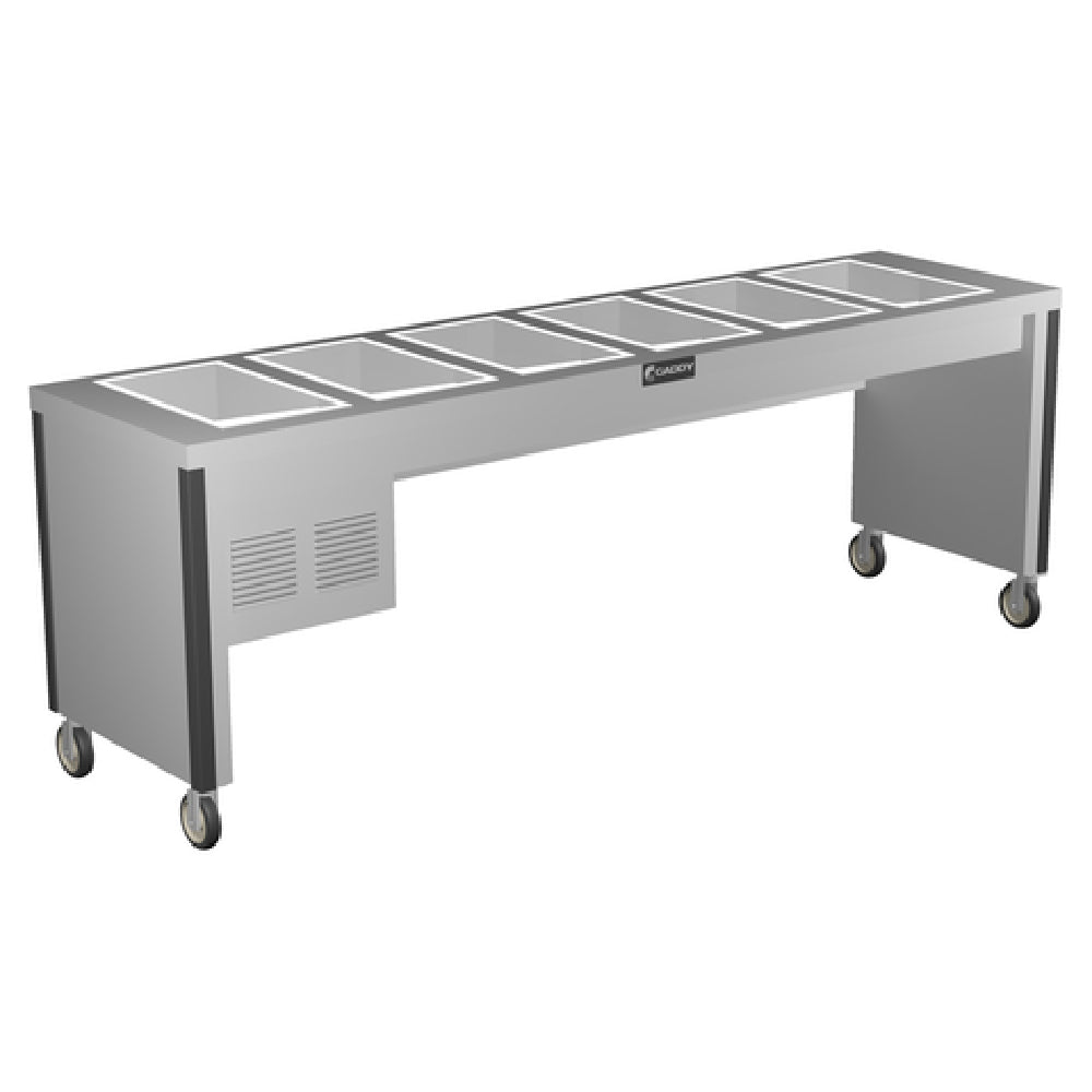 The Caddy RIF-606 Cold Pan Unit Electric 97"W x 26"D x 34-1/2"H is a versatile refrigeration solution designed for commercial kitchens requiring efficient and reliable cold storage. This unit features an open base with six 12" x 20" openings, sized at 20" from front to back, allowing for ample storage of various ingredients. Crafted with durable stainless steel construction, it ensures longevity and resistance to corrosion. The vertical corner bumpers provide additional protection against impacts, while the 4" heavy-duty swivel casters, two of which come with brakes, enhance mobility and stability. Operating at 120v/60/1-ph with an 8.8-amp power draw and a 1/2 hp self-contained refrigeration system, it maintains optimal cooling performance. It comes equipped with a cord and plug, featuring a NEMA 5-15P configuration for convenient electrical connectivity. The Caddy RIF-606 is ETLus and NSF certified, affirming its compliance with safety and sanitation standards. Its practical design and technical specifications make it an ideal choice for restaurants, catering services, and foodservice establishments seeking effective cold storage and serving options.