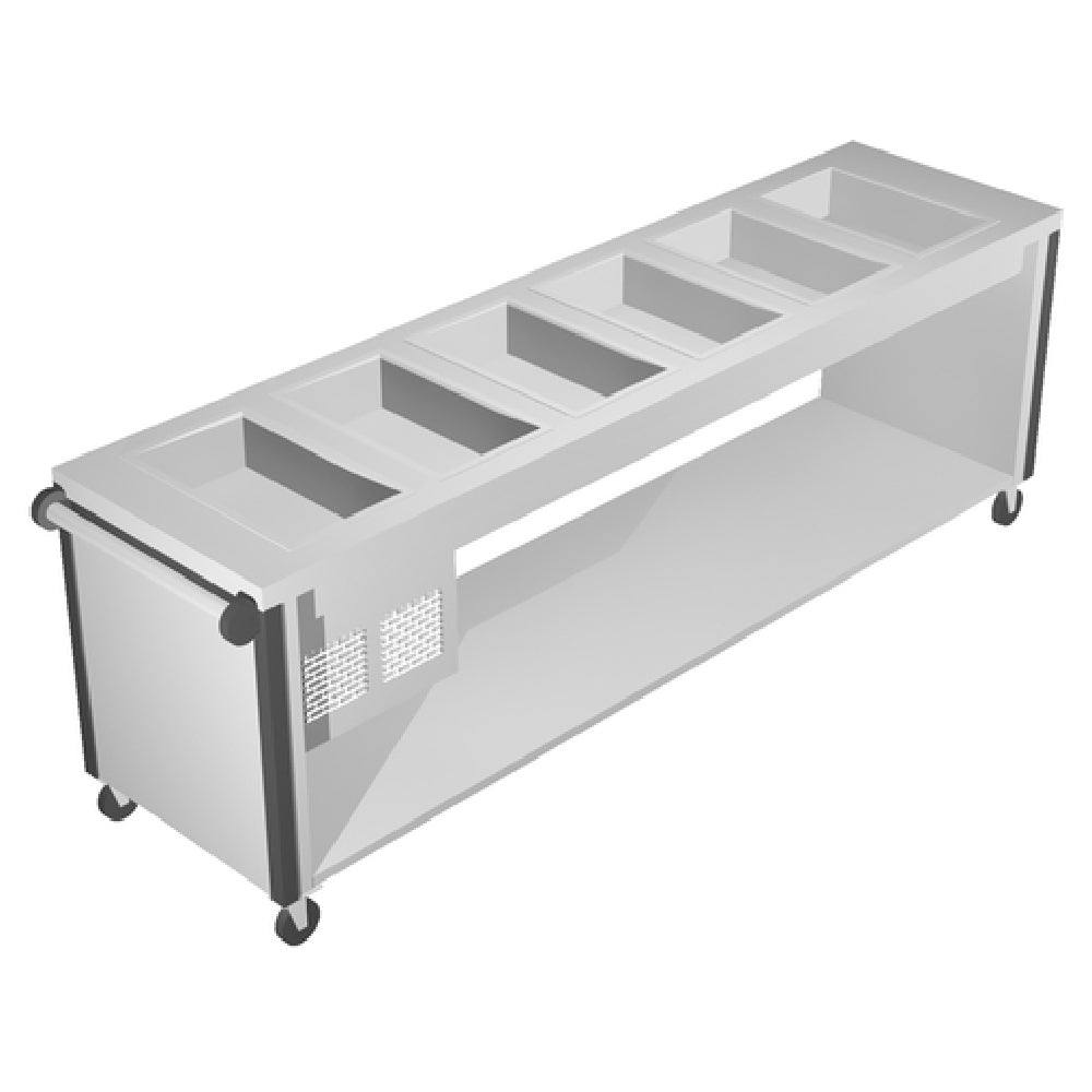 The Caddy RIF-607 Cold Pan Unit Electric 133"W x 26"D x 34"H is a highly efficient solution designed for various food service environments, offering reliable cold storage capabilities. This unit features an open base and provides seven 12" x 20" openings, accommodating diverse storage needs with dimensions of 20" front to back. Crafted from durable stainless steel, the Caddy RIF-607 ensures longevity and resilience in demanding kitchen settings. It is equipped with vertical corner bumpers for enhanced protection and 4" heavy-duty swivel casters, with two casters featuring brakes for stability and mobility. The refrigeration system is self-contained and runs on a 1/2 horsepower electric motor, powered by a 120v/60/1-ph electrical connection, and includes a cord with a NEMA 5-15P plug. Certified by ETLus and NSF, this cold pan unit meets essential safety and sanitation standards, making it a prudent choice for commercial kitchens. The Caddy RIF-607 Cold Pan Unit is tailored for the rigorous demands of the food service industry, delivering dependable performance with advanced design features that cater to both large-scale operations and smaller setups requiring flexible, secure cold storage solutions.
