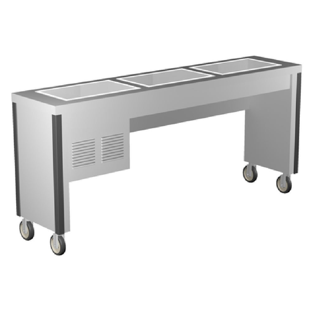 The Caddy RIF-613 Cold Pan Unit Electric Slimline is a precision-engineered refrigeration solution designed to meet the needs of commercial food service environments. Measuring 75 inches in width, 18 inches in depth, and 34-1/2 inches in height, this unit is efficiently sized for tight spaces while offering robust functionality. It features an open base and accommodates three 12-inch by 20-inch openings, allowing for a versatile range of cold food storage options. Constructed from stainless steel, the unit ensures durability and corrosion resistance, complemented by vertical corner bumpers for added protection. The RIF-613 includes 4-inch heavy-duty swivel casters, two of which are equipped with brakes, facilitating easy mobility and secure positioning. Operating on a 120v/60/1-ph electrical system, it requires 5.8 amps and delivers a 1/4 hp output. Its self-contained refrigeration system includes a cord with plug, featuring a NEMA 5-15P configuration, ensuring straightforward installation. Certified by ETLus and NSF, this unit meets rigorous safety and sanitation standards, making it an ideal choice for professional kitchens seeking reliable cold storage in a compact, mobile format. The Caddy RIF-613 is a testament to innovative design, offering exceptional functionality in a sleek, slimline package.