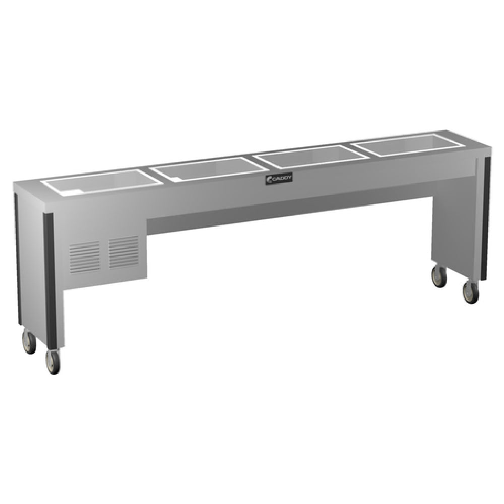 The Caddy RIF-614 Cold Pan Unit Electric Slimline is a highly efficient refrigeration solution designed for commercial settings requiring precise cold storage. Measuring 99 inches wide by 18 inches deep and standing 34-1/2 inches tall, this unit provides an ample, compact solution with an open base designed for ease of access and integration into existing kitchen setups. Featuring four 12-inch by 20-inch openings, each with a depth allowing 12 inches front to back, this unit ensures versatile storage configurations to accommodate various pans and trays. Constructed from durable stainless steel, the Caddy RIF-614 guarantees longevity and seamless integration into any professional kitchen environment. The inclusion of vertical corner bumpers aids in minimizing damage during use, while the 4-inch heavy-duty swivel casters, two of which have brakes, offer superior mobility and stability. Operating at 120 volts, 60 Hz, and drawing 5.8 amps, it utilizes a 1/4 horsepower self-contained refrigeration system to maintain optimal cooling conditions. The unit is equipped with a cord and plug conforming to NEMA 5-15P standards, ensuring compatibility and safety. Certified by ETLus and NSF, the Caddy RIF-614 Cold Pan Unit guarantees adherence to strict safety and sanitation standards, making it an invaluable asset for food service operations.