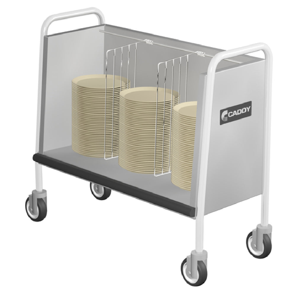 The Caddy T-145 Dish/Tray Caddy is an unheated, single unit designed to efficiently store and transport large volumes of dinnerware. Measuring 35-1/2 inches in width, 15-3/4 inches in depth, and 30 inches in height, this caddy is engineered to accommodate approximately 120 plates of 9 inches, 160 plates of 7 inches, 200 plates of 6 inches, or 240 plates of 5 inches. Its open design, without a cover, facilitates easy access and handling, making it a practical choice for high-turnover environments. Constructed from welded stainless steel, it combines durability with ease of maintenance, ensuring a long service life in busy settings. The continuous neoprene bumper encased in a stainless steel channel frame provides additional protection against impacts during transport. The mobility of the Caddy T-145 is enhanced by its 4-inch swivel casters, allowing smooth movement across various surfaces with minimal effort. Certified by NSF, it meets health and safety standards, making it suitable for use in professional kitchens, catering services, and banquet halls. Its sturdy construction and large capacity make it an indispensable tool for efficiently managing dishware logistics in food service operations of varying scales.
