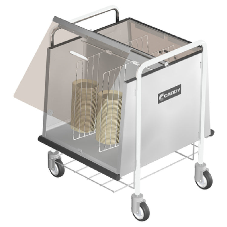 The Caddy T-160-SU Cup & Saucer Caddy is a meticulously designed storage solution measuring 25-3/4"W x 26-1/4"D x 30"H. This double-sided unit is crafted to maximize efficiency and space utilization in professional settings such as cafeterias and large-scale dining facilities. Its unheated and enclosed design features a hinged folding acrylic cover, allowing for easy access while maintaining cleanliness and protection for stored items. With a substantial capacity, it can accommodate up to 240 saucers or 112 cups, making it an ideal choice for high-demand environments. Constructed from welded stainless steel, the caddy ensures longevity and durability, while the continuous neoprene bumper adds an extra layer of protection during movement. The inclusion of a wire shelf under the main storage area provides additional space for tray storage, enhancing its utility. For ease of mobility, the unit is equipped with 4" swivel casters, allowing it to be effortlessly repositioned as needed. NSF certification highlights its adherence to public health and safety standards, making the Caddy T-160-SU a reliable and efficient choice for establishments requiring robust storage solutions for crockery.