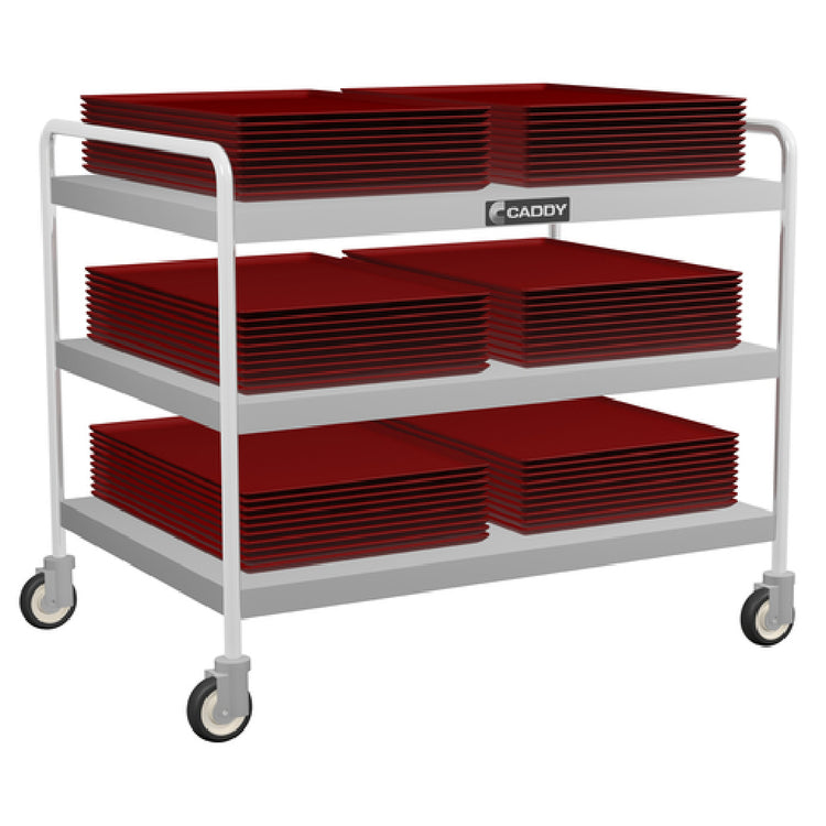 The Caddy T-203-B "B" Series Utility Caddy is a versatile and robust solution for various industry needs, featuring an open base design with dimensions of 38-1/2"W x 22-1/2"D x 34-3/4"H. This utility caddy is equipped with three shelves, each with notched corners, offering a generous shelf size of approximately 36" x 24". The shelves boast an 8-1/4" clearance, providing ample space for storage and easy access to items. Designed with user convenience in mind, it includes two U-shaped handles for easy maneuverability. Constructed entirely from stainless steel, this utility caddy ensures long-lasting durability and resistance to corrosion, making it suitable for demanding environments. It is fitted with 4" polyurethane swivel casters, allowing for smooth and effortless movement across different surfaces, while ensuring stability and support for heavy loads. The Caddy T-203-B is NSF certified, attesting to its compliance with public health and safety standards, making it an ideal choice for commercial kitchens, healthcare facilities, and other professional settings where reliable utility transport solutions are required. Its combination of practical design and quality construction ensures it meets the diverse demands of various industry segments.