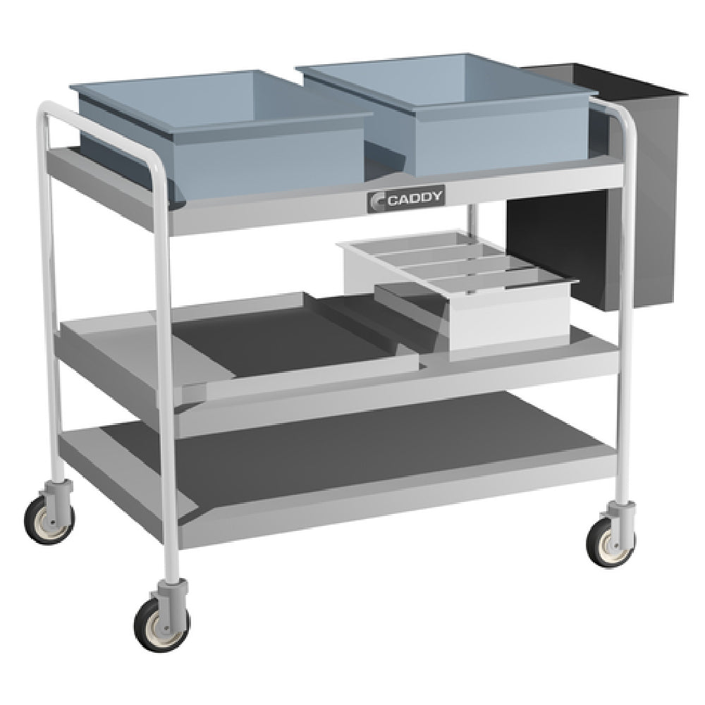 The Caddy T-209 Bussing Caddy is a versatile and efficient solution for the food service industry, featuring an open design with dimensions of 21"D x 33"W x 34-3/4"H. This bussing caddy is equipped with three spacious shelves, providing ample storage and organization capacity. It includes two PL-1520 plastic dish boxes and a four-compartment plastic silver box, ensuring efficient separation and storage of various items. The caddy also features a stainless steel tray designed specifically for glass racks and a removable stainless steel refuse container, enhancing its functionality and ease of use. Constructed from durable stainless steel, the Caddy T-209 ensures longevity and resilience in demanding environments. It is fitted with 4" heavy-duty swivel casters, offering smooth and easy maneuverability across different surfaces, ideal for dynamic food service operations. The Caddy T-209 Bussing Caddy is NSF certified, highlighting its commitment to maintaining high public health and safety standards in professional settings. This caddy is an essential asset for restaurants, hotels, and catering services seeking reliable and efficient bussing solutions.