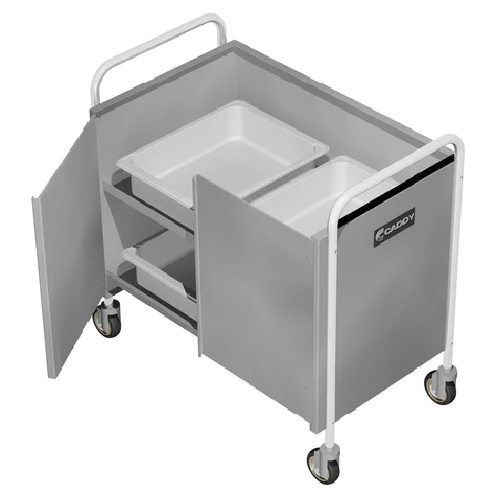 The Caddy T-214 Bussing Caddy 23"D X 35-3/4"W X 35-1/2"H Enclosed Back & Sides is a highly functional and durable utility cart crafted for efficiency in food service environments. With its substantial dimensions of 23 inches in depth, 35-3/4 inches in width, and 35-1/2 inches in height, this caddy is designed to accommodate a variety of storage and transport needs. It features two spacious shelves, with the top shelf recessed by 11 inches, providing ample space for secure storage of items during transit. Constructed from stainless steel, the Caddy T-214 ensures long-lasting durability and resistance to corrosion, making it suitable for rigorous daily use. The enclosed back and sides provide added security for contents, while the two hinged doors made from fiberglass reinforced plastic enhance durability and ease of access. Equipped with continuous neoprene bumpers set in stainless steel channels on the sides, this caddy minimizes impact damage during movement. It is mounted on 4-inch heavy-duty swivel casters, ensuring seamless maneuverability across various floor surfaces. NSF certification underscores its adherence to public health standards, making it a reliable choice for commercial kitchens, hotels, and caterers seeking a robust bussing solution.