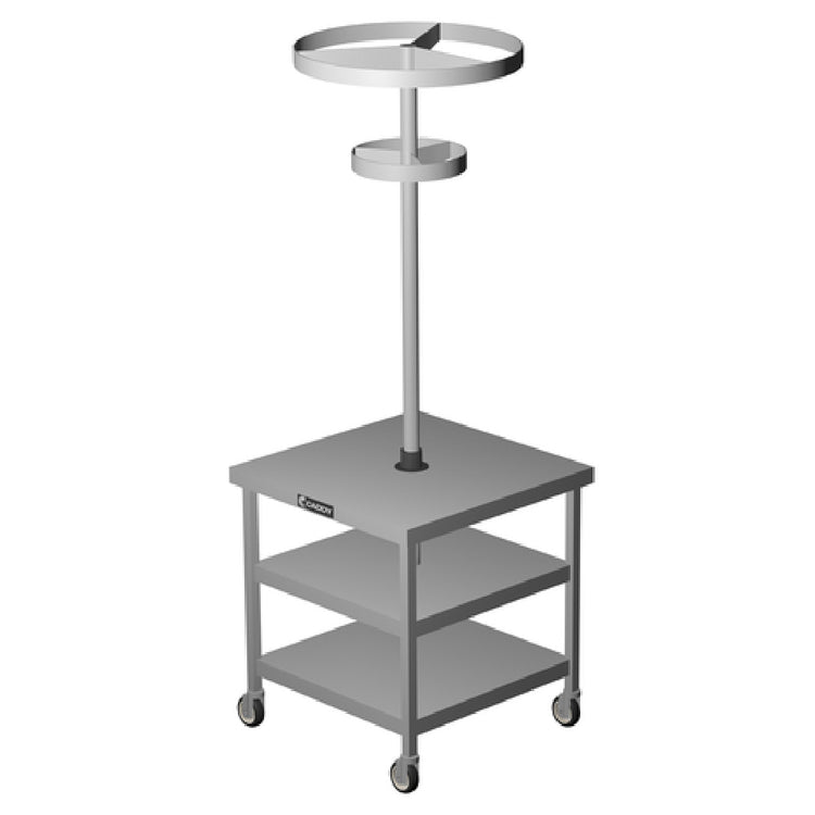 The Caddy T-247 Utensil Caddy is a versatile and robust utensil storage solution, measuring 30 inches in width, 30 inches in depth, and extending to a height of 84 inches. This open-base unit features three shelves, providing ample space for organizing kitchen essentials. The design incorporates two revolving racks, with the upper rack having a diameter of 25.5 inches and the lower 13 inches, maximizing the caddy's storage capabilities. Equipped with 15 hooks, it allows for efficient hanging of various utensils, ensuring easy accessibility. The unit's construction is of high-quality stainless steel, ensuring durability and longevity, making it suitable for demanding kitchen environments. The Caddy T-247 is designed with mobility in mind, featuring 5-inch swivel casters, two of which are equipped with brakes, allowing for secure placement and easy transportation. This utensil caddy is NSF certified, highlighting its compliance with strict public health and safety standards. Ideal for commercial kitchens, catering services, and other food service operations, the Caddy T-247 provides a reliable and efficient organizational solution, combining practicality with robust construction to meet the diverse needs of the industry.