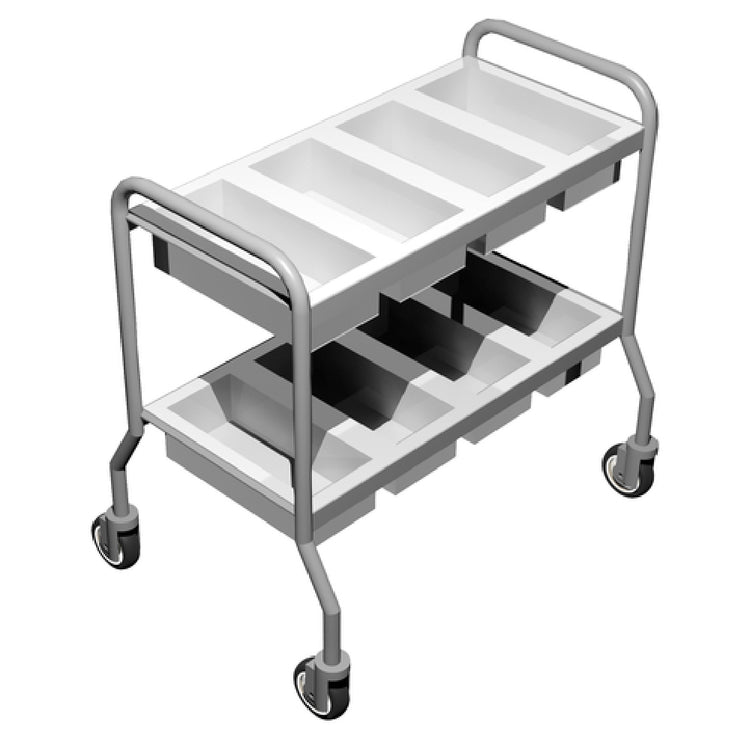 The Caddy T-305 Bulk Silver Caddy is a versatile storage solution, specifically designed for commercial environments, measuring 32-1/2" in width, 22-1/2" in depth, and 30-3/4" in height. It features two shelves, providing ample space for organizing materials efficiently. Its construction embodies durability with high-quality stainless steel, ensuring longevity and resistance to corrosion, making it an ideal choice for demanding settings. The caddy includes eight removable stainless steel pans, each measuring 11-1/2" x 6" x 6" deep, allowing for customizable storage options and easy access to stored items. The inverted U-shaped legs provide structural stability while the 4" swivel casters afford smooth mobility, facilitating effortless movement within different workspaces. This product is NSF certified, guaranteeing it meets strict public health and safety standards. The Caddy T-305 is strategically crafted for industries such as food service, catering, and hospitality, where efficient organization and reliable storage are paramount. Its thoughtful design and robust construction make it an indispensable tool for professionals seeking to streamline their operations while maintaining high standards of hygiene and functionality.