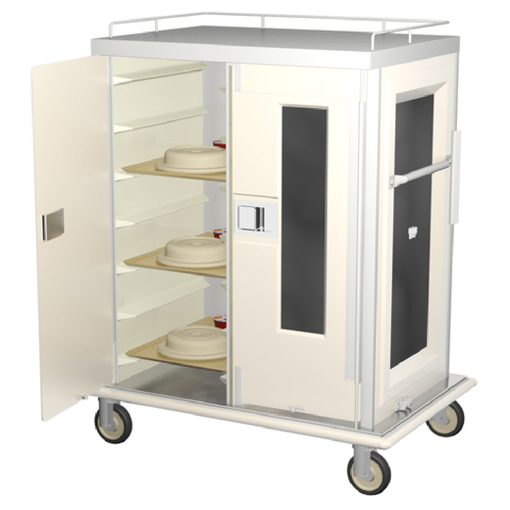 The Caddy TD-614-D Tray Delivery Truck is a robust and practical solution designed for efficient transport within food service environments. This non-insulated unit features two doors and two compartments, accommodating up to 14 trays, which are supported by formed tray slides with a 2-inch clearance, ensuring secure and organized storage. It is constructed from super-impact polymer, providing durability and resilience in high-traffic areas. The truck is equipped with a stainless steel push handle and a stainless steel top, bottom, and back, enhancing its structural integrity and ease of handling. For added convenience and identification, a card holder is integrated into the design. The full perimeter non-marking bumper ensures that both the truck and surroundings are protected from damage during transport. Mobility is facilitated by 6-inch polyurethane casters, featuring two swivel and two rigid configurations for smooth maneuvering. Certified by NSF, this tray delivery truck adheres to stringent health and safety standards, making it suitable for various institutional settings, including hospitals and catering services. Its innovative design and functional features make it an invaluable asset for operations seeking reliable and efficient meal delivery solutions.