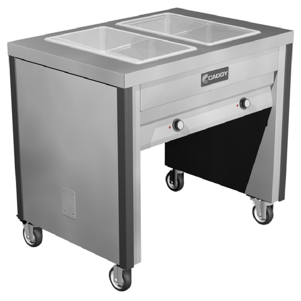 The Caddy TF-602 Hot Food Caddy Electric Open Base is a versatile tool for the food service industry, adeptly designed to meet the demands of various market segments with its efficient and user-friendly features. Measuring 37"W x 26"D x 34"H, this electric caddy is constructed from durable stainless steel, ensuring longevity and resilience in busy commercial settings. The unit includes two 12" x 20" x 6-3/8" deep insulated hot food wells, each with individual heat controls, allowing for precise temperature management of different food items. The tilted control panel enhances ease of use, facilitating quick adjustments and monitoring of the heating elements. Equipped with vertical corner bumpers, this caddy is protected against accidental impacts, maintaining its integrity and appearance over time. For mobility, the caddy is outfitted with 4" swivel casters, two of which include brakes to secure the unit in place when needed. Certified by ETLus and NSF, the Caddy TF-602 meets rigorous safety and sanitation standards, making it a reliable choice for catering services, buffets, and institutional dining environments. Its open base design adds to its functionality, offering additional storage space or ease of integration into existing service setups.