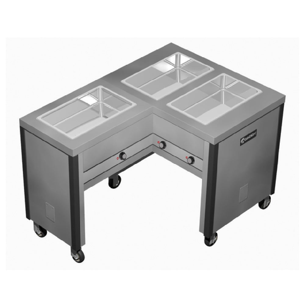 The Caddy TF-603-L Hot Food Caddy Electric Open Base is a versatile and efficient solution for maintaining the temperature of hot foods in various food service settings. This model features three 12" x 20" x 6-3/8" deep hot food wells, each designed with an L-shaped, left-handed configuration to optimize space and accessibility. Each well is insulated and equipped with individual heat controls, allowing precise temperature management to suit different food types. Constructed from durable stainless steel, this hot food caddy is built to withstand the rigors of busy kitchen environments. The inclusion of vertical corner bumpers provides additional protection against impacts, preserving the caddy's structural integrity. For ease of mobility, the unit is fitted with 4" swivel casters, two of which are equipped with brakes to ensure stability when needed. This caddy is ETLus and NSF certified, reflecting its adherence to stringent safety and sanitation standards. The Caddy TF-603-L Hot Food Caddy Electric Open Base serves as an essential tool for catering businesses, restaurants, and other food service operations that require reliable and adjustable hot food holding solutions.