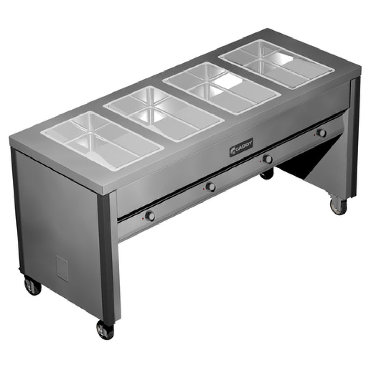 The Caddy TF-604 Hot Food Caddy Electric Open Base is a robust and versatile solution for the food service industry, designed to maintain optimal temperatures for a variety of hot foods. This electric caddy, measuring 67"W x 26"D x 34"H, is equipped with four 12" x 20" x 6-3/8" deep hot food wells, each featuring insulated construction and individual heat controls. This allows for precise temperature management, ensuring food remains at the desired temperature for extended periods. The thoughtfully designed tilted control panel enhances usability, providing easy access to adjustments. Constructed from durable stainless steel, the caddy is built to withstand the demands of a busy kitchen environment. For mobility and convenience, it includes 4" swivel casters, with two equipped with brakes for secure positioning. Additionally, the vertical corner bumpers provide added protection during movement. Certified by ETLus and NSF, this unit meets rigorous standards for safety and sanitation, making it a reliable asset for commercial kitchens, catering services, and buffets that require consistent heating and portability. The open base design further adds to its functionality, allowing for easy storage or additional equipment placement underneath, thereby maximizing kitchen space efficiency.