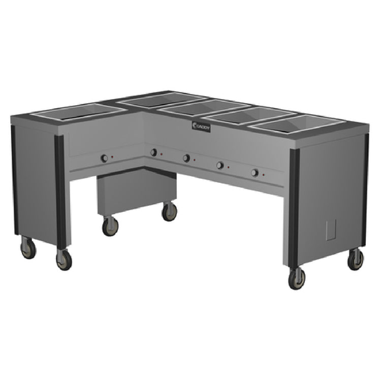 The Caddy TF-605-L Hot Food Caddy Electric Open Base is a specialized unit designed for efficient meal service across various industry segments, such as catering, institutional dining, and large-scale food service operations. This versatile caddy features five L-shaped, left-handed hot food wells, each measuring 12" x 20" x 6-3/8" deep, allowing for optimal heat distribution and storage of different dishes simultaneously. Each insulated well is equipped with individual heat controls, providing precise temperature management tailored to specific food items. Constructed from durable stainless steel, the unit boasts vertical corner bumpers, enhancing its safety and durability by minimizing potential impact damage. Mobility is facilitated through its 4" swivel casters, two of which include brakes for secure positioning during service. Certified by ETLus and NSF, this unit complies with rigorous safety and sanitation standards, making it a reliable choice for maintaining food quality and safety. The Caddy TF-605-L’s open base design not only supports ease of access and cleaning but also offers flexibility in accommodating additional storage needs, making it an invaluable asset for food service environments where efficiency and reliability are paramount.