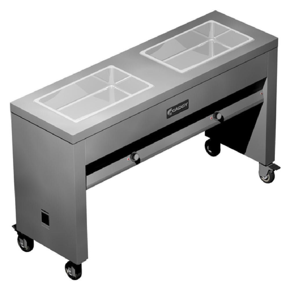 The Caddy TF-612 Hot Food Caddy Electric Slimline is a precise solution for those seeking efficient and compact food warming equipment in the foodservice industry. With a slimline design measuring 53 inches wide, 18 inches deep, and 34 inches high, it is tailored for environments with limited space. This unit features two insulated hot food wells, each measuring 12 inches by 20 inches and 6-3/8 inches deep, allowing for optimal temperature retention and individual heat control, making it adaptable for a variety of hot food items. Constructed from stainless steel, the Caddy TF-612 ensures durability and ease of maintenance. The open base design enhances accessibility, while the tilted control panel provides user-friendly operation. For added convenience, the unit is equipped with 4-inch swivel casters—two of which include brakes—facilitating mobility and stability within any kitchen setup. Vertical corner bumpers add an extra layer of protection during movement. Certified by ETLus and NSF, this hot food caddy meets rigorous safety and sanitation standards, making it a reliable choice for catering businesses, buffets, and commercial kitchens that demand consistent quality and performance in hot food delivery. This product is a testament to thoughtful engineering designed to meet the diverse needs of the culinary sector.