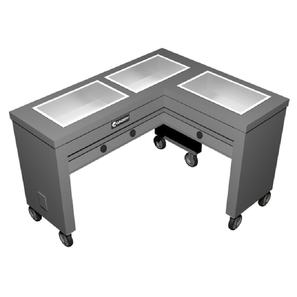 The Caddy TF-613-R Hot Food Caddy Electric Slimline is an innovative solution designed for professional kitchens that require efficient hot food storage and service. This electric caddy features an open base design, accommodating three 12" x 20" x 6-3/8" deep hot food wells, providing ample space for a variety of food items. Its L-shaped, right-handed configuration ensures easy access and convenient operation. Each insulated well is equipped with individual heat controls, allowing precise temperature management to maintain food quality. Constructed from durable stainless steel, the Caddy TF-613-R is built to withstand the demands of busy food service environments. The vertical corner bumpers provide added protection against impacts, ensuring longevity. The unit is designed with 4" swivel casters, two of which have brakes, for reliable mobility and stability. Certified by ETLus and NSF, it meets rigorous industry standards for safety and sanitation. This hot food caddy is an ideal choice for catering services, restaurants, and food courts that require a reliable and space-efficient solution for keeping food hot and ready for service. Its sleek and functional design makes it a valuable asset for any food service operation looking to optimize space and maintain high-quality food offerings.