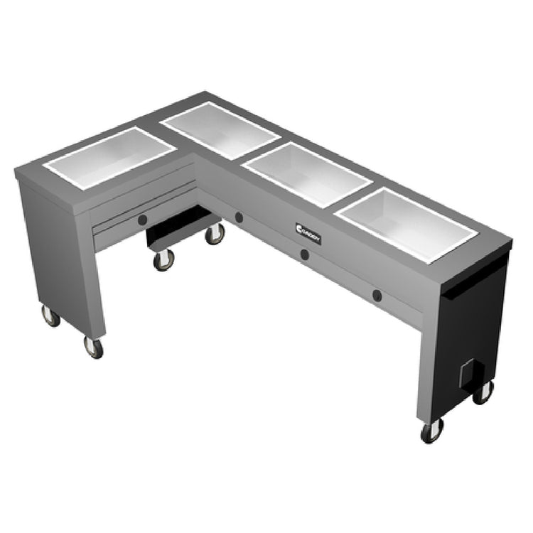 The Caddy TF-614-L Hot Food Caddy Electric Slimline is an innovative solution for commercial kitchens, offering compact dimensions without compromising on functionality. Equipped with four 12" x 20" x 6-3/8" deep hot food wells, this L-shaped, left-handed unit is tailored for establishments that demand efficiency and precision in food service. Each insulated well comes with its own individual heat control, allowing for meticulous temperature management of various dishes. Crafted from high-grade stainless steel, the Caddy TF-614-L ensures durability and longevity in demanding environments. The open base design enhances storage options, while the vertical corner bumpers provide additional protection during transport. With its 4" swivel casters, including two with brakes, this hot food caddy is easily maneuverable, making it versatile for both stationary and mobile food service operations. Certified by ETLus and NSF, it adheres to stringent safety and sanitation standards, making it a trusted choice for professional foodservice applications. The Caddy TF-614-L is a formidable asset for caterers, hotels, and restaurants seeking a reliable and efficient means to keep hot foods at optimal serving temperatures.