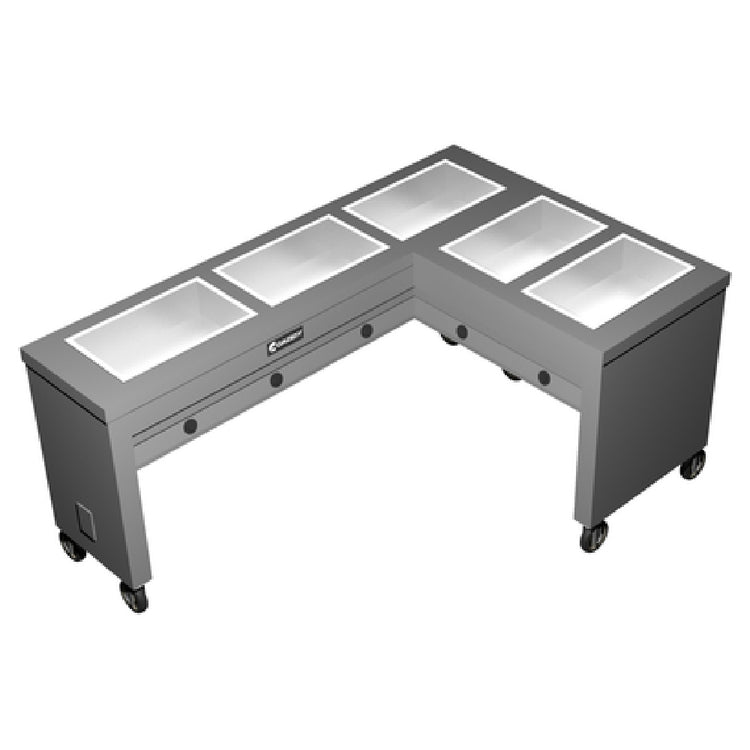 The Caddy TF-615-R Hot Food Caddy Electric Slimline is a highly efficient and versatile solution for maintaining hot food temperatures in various culinary environments. With its slimline design, it fits seamlessly into compact spaces, catering to establishments requiring efficient use of space. This electric caddy features an open base design and accommodates five 12" x 20" x 6-3/8" deep hot food wells, arranged in an L-shaped, right-handed configuration. Each well is insulated and equipped with individual heat controls, allowing precise temperature management for different food items. Constructed with durable stainless steel, the TF-615-R ensures long-lasting performance and easy maintenance, making it suitable for busy kitchens. It includes vertical corner bumpers to protect the unit from impacts and enhance durability. The caddy is mounted on 4" swivel casters, two of which have brakes, providing mobility and stability as needed. Certified by ETLus and NSF, this hot food caddy meets stringent safety and sanitation standards, making it an ideal choice for restaurants, catering services, and food service operations that prioritize food safety and quality. Its technical specifications and practical design make the Caddy TF-615-R an indispensable tool for any food service professional seeking reliable hot food management solutions.