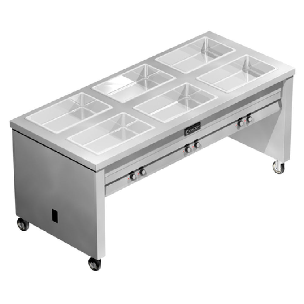 The Caddy TF-616 Hot Food Caddy Electric Open Shelf Base is a high-performance food service solution featuring (6) 12" x 20" x 6-3/8" deep hot food wells, ideal for maintaining the temperature of multiple dishes simultaneously. Measuring 76"W x 33"D x 34"H, this caddy is constructed from durable stainless steel, ensuring longevity and resistance to the rigors of a busy kitchen environment. It is designed with insulated wells, each equipped with individual heat controls, allowing for precise temperature management tailored to different culinary needs. The unit's mobility is enhanced by 4" heavy-duty swivel casters, with two of these featuring brakes for stability during use. Vertical corner bumpers provide additional protection against wear and tear, making it suitable for high-traffic settings. Its electric design comes with a convenient cord and plug, facilitating straightforward integration into existing kitchen setups. Certified by ETLus and NSF, this hot food caddy meets stringent safety and sanitation standards, making it a trusted choice for catering businesses, restaurants, and other food service operations that require reliable hot food holding solutions.